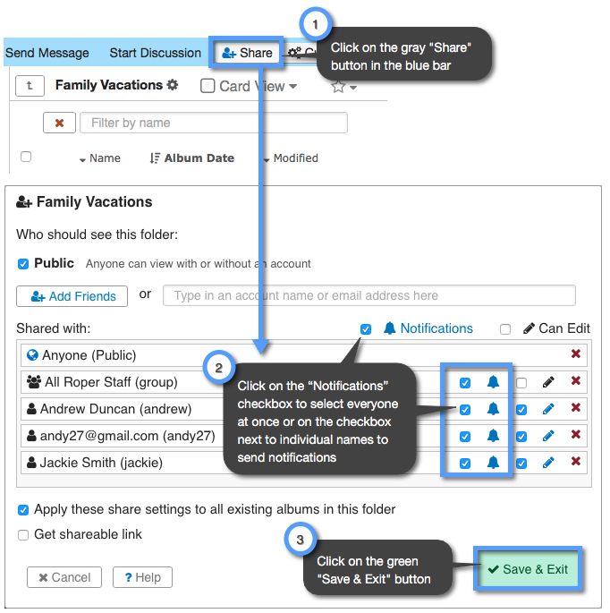 If the “Notifications” boxes are not checked, then anyone you have shared your Photo Album with will not be notified of any new changes or shares regarding this Photo Album.