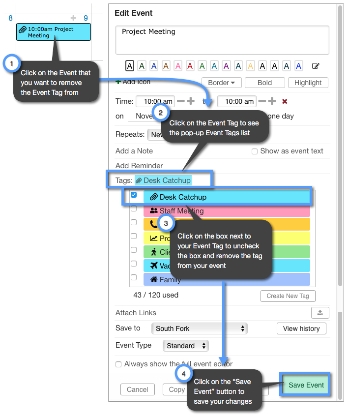 To remove the tag from your Event, all you need to do is click on your Event Tag (in the example below this is the “Phone Call” tag) in the Event editor box and click on the box next to the Event Tag to un-check it. Follow the steps in the image below:
