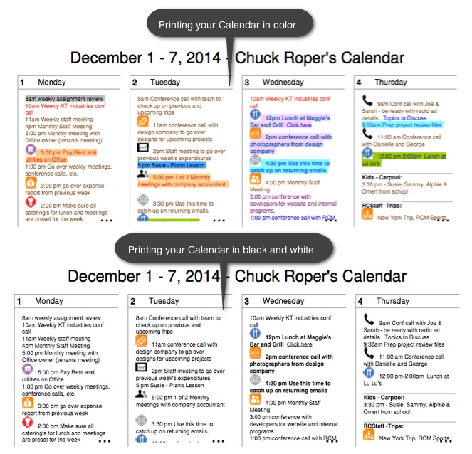 When you add a custom color theme or are using Event Tags on your Calendar, you may want to print a black and white version of your Calendar without all of these colors. By default, your Calendar will print in color but if you open your Calendar’s print dialog, there is an option that you can select to print your Calendar in black and white. Using this option will not affect any of the original Calendar theme or Event Tag colors on your Calendar. In the image below you can see the difference between printing your Calendar in color versus printing your Calendar in black and white: