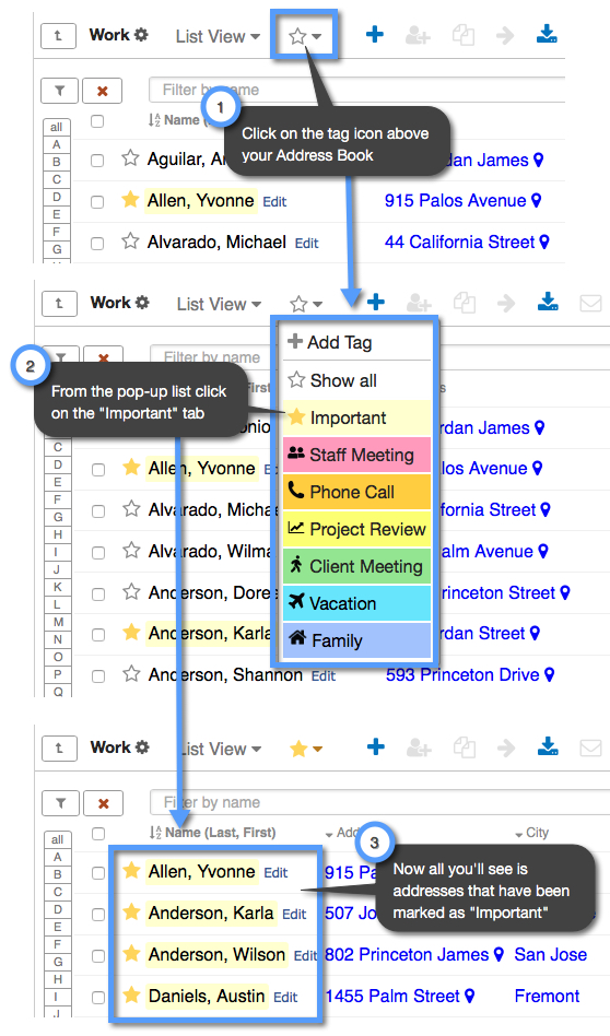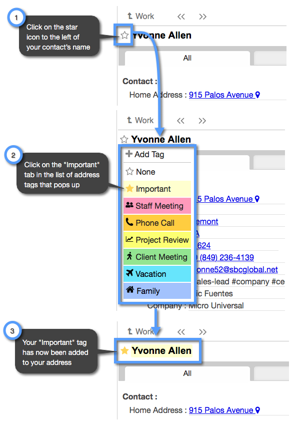 To add a star while you are viewing your addresses in your folder follow the steps in the image below: