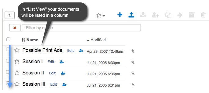 In “List View” your Documents will be listed horizontally in a single column, much like if you were viewing your Documents in a folder on your computer. The name of your Document will be listed on the left-hand side of the screen and the date that your Document was last modified will be listed on the right.
