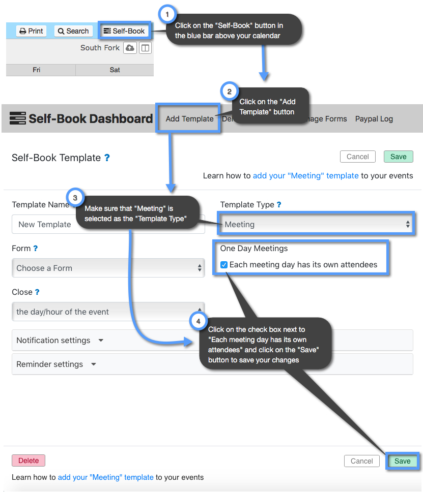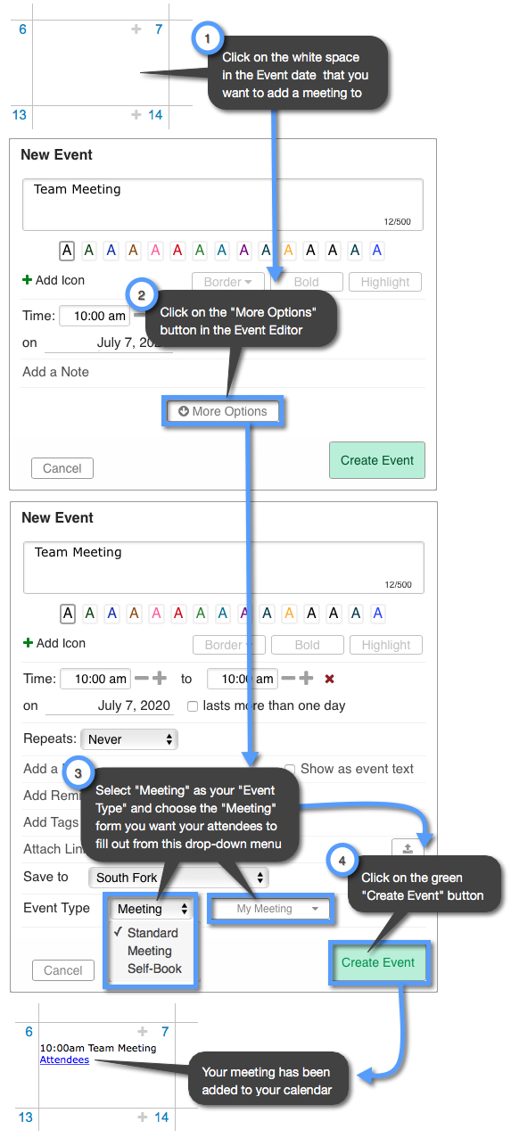 Once you have created your custom Meeting template, you will then need to create your repeating series of Meetings in your calendar. Follow the steps in the image below: