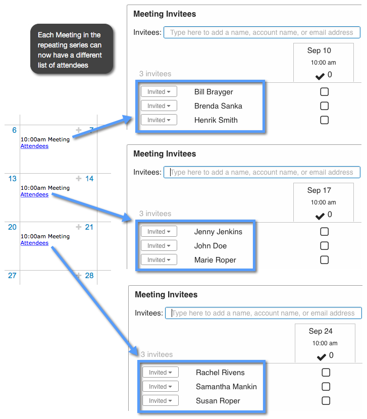 Now when you click on the blue "Attendees" link for each meeting, you can invite a different list of attendees.