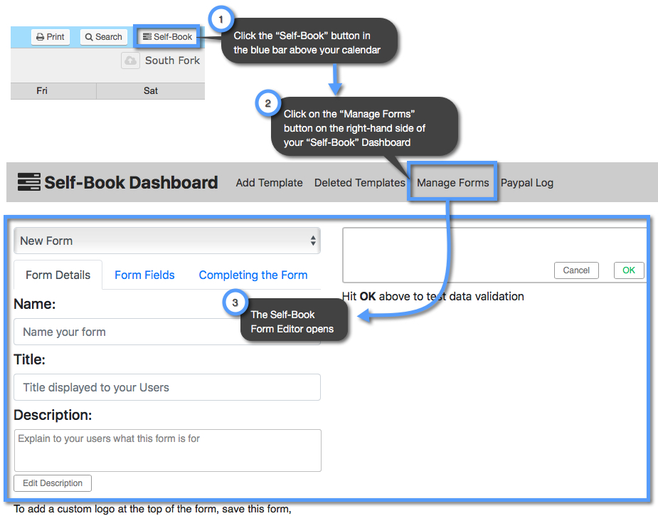 First, you will need to open the Self-Book form editor. Follow the steps in the image below: