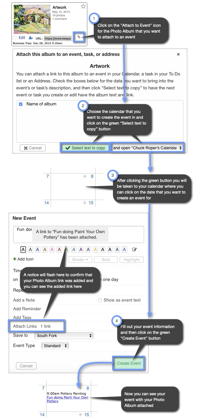 When you are viewing your Photo Albums in a folder you will see a small calendar icon. If you click on this small link icon you can easily attach a link for your Photo Albums to events in your calendar. Clicking on the “Attach to Event” icon will automatically copy a link to your Photo Album and it will take you to your “Calendars” screen. This link will stay copied until you create a new Calendar Event, where a link to the Photo Album will instantly show up in your Event without any extra work by you. This is faster than adding the Photo Album link manually to your Event.