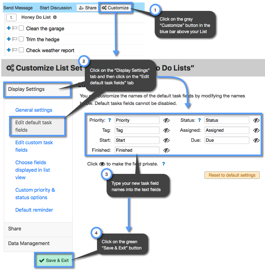 To learn how to customize your Task field names follow the steps in the image below: