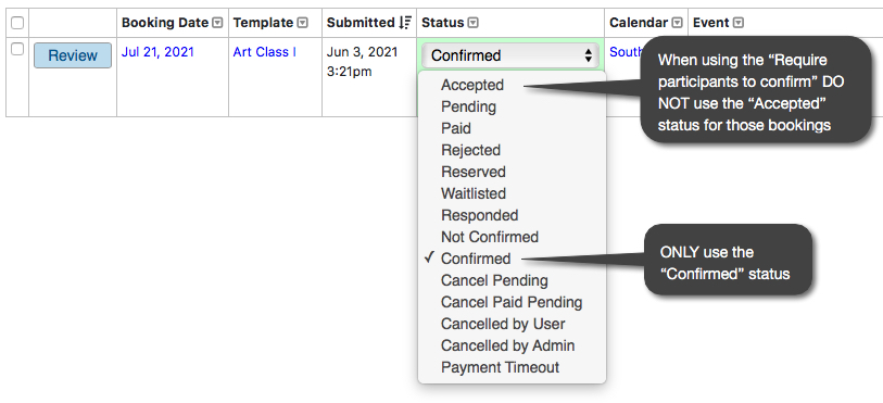 Also please note that when you are using the "Reserve for Approval" processing type and the "Require participants to confirm" together, then you will have to use the "Not confirmed" status to start the acceptance booking process instead of changing booking statuses to "Accepted." This will ensure that the "Confirmation required" email will be sent out to your participants.